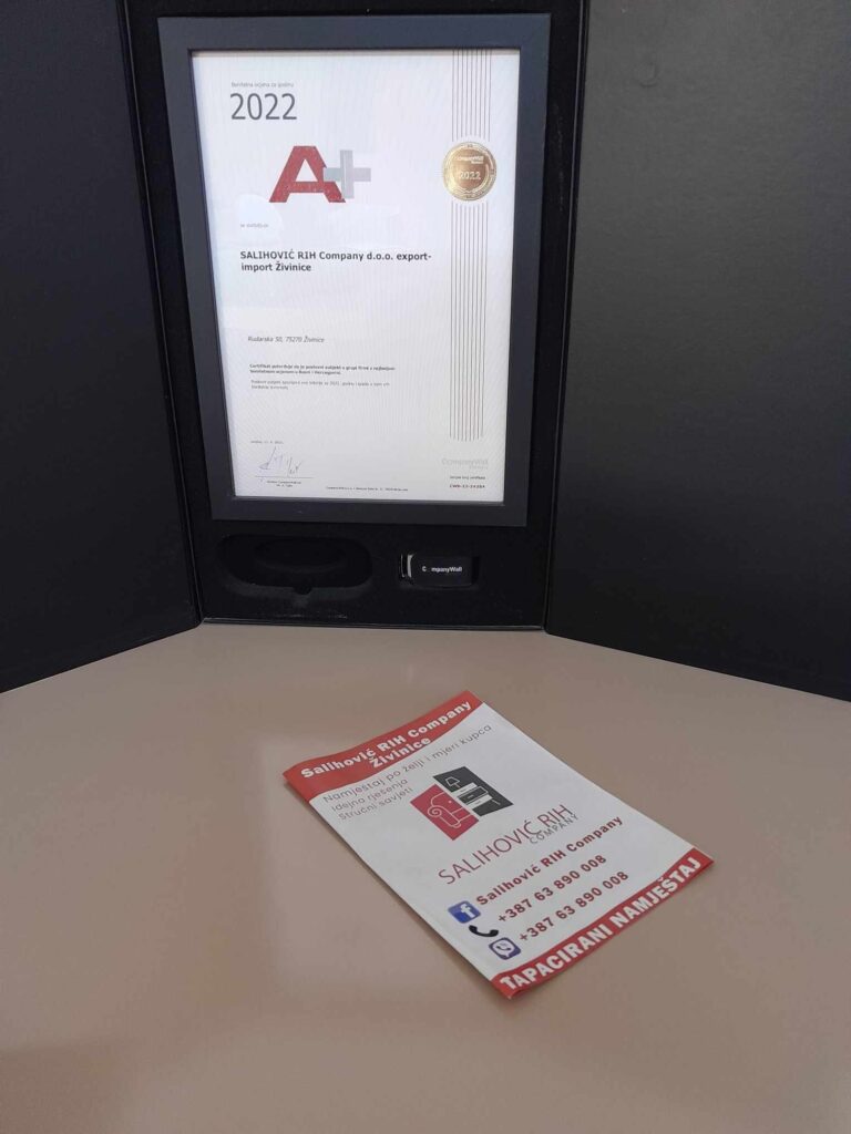 Salihović RIH Company spada u grupu firmi sa najboljom bonitetnom ocjenom u BiH — potvrda stabilnog i pouzdanog poslovanja.